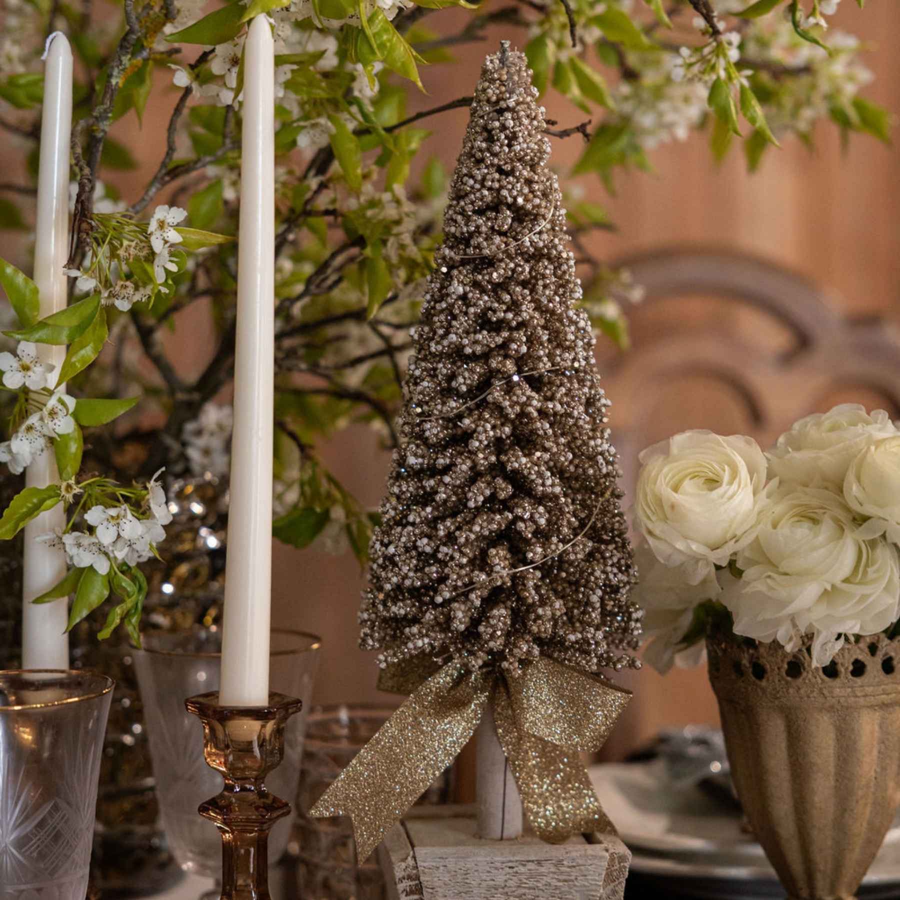 A gorgeous set of Christmas trees wrapped in fairy lights and finished with a bow at the base. A charming duo that brings a soft glow and a touch of magic to your holiday table.