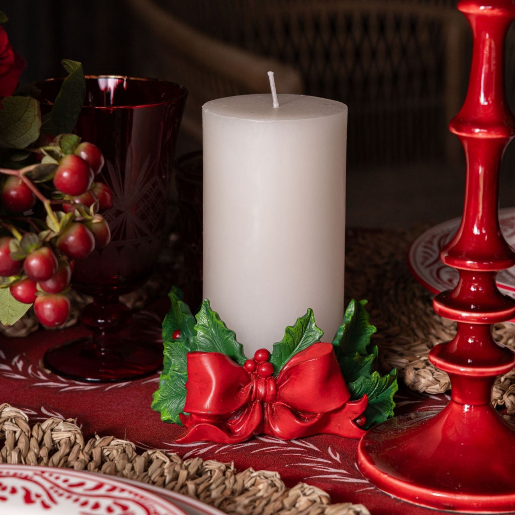 Add a touch of Christmas charm with these holly themed candle holders, designed to hold pillar candles beautifully. Their festive design brings warmth and tradition to your holiday décor.
